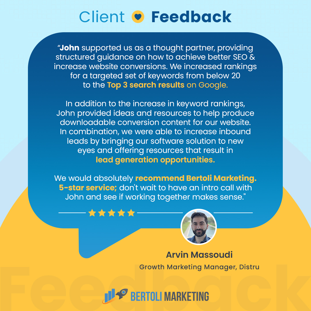 “Bertoli Marketing completely transformed our digital presence. The new website not only looks fantastic but is strategically designed to convert visitors into leads. Their marketing support — from content to campaigns — has been invaluable in helping us clearly communicate our value and generate consistent opportunities. They’ve been more than a partner; they’ve been a true extension of our team. If you’re on the fence, stop fretting! Push that “Sign Me Up” button right now.